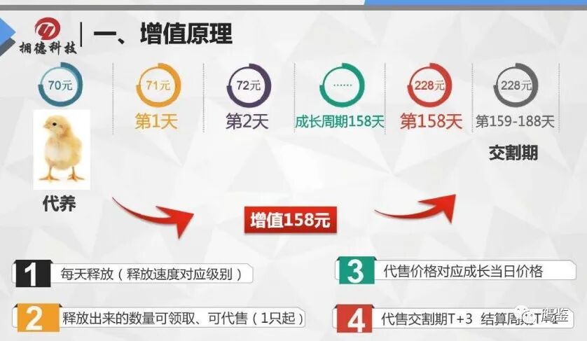 一只生态土鸡生长周期为158天,从购买之日起每天增值,增值金额直接返现到个人账号中。经过158天的饲养周期长成后,会员可以把成鸡领取回家,也可以让德烨兴公司代售出去,公司收每只鸡销售价10%的服务费及1%的提现手续费。