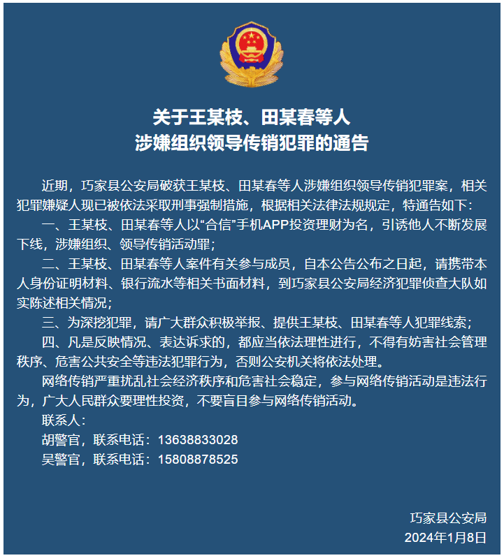 关于王某枝、田某春等人涉嫌组织领导传销犯罪的通告