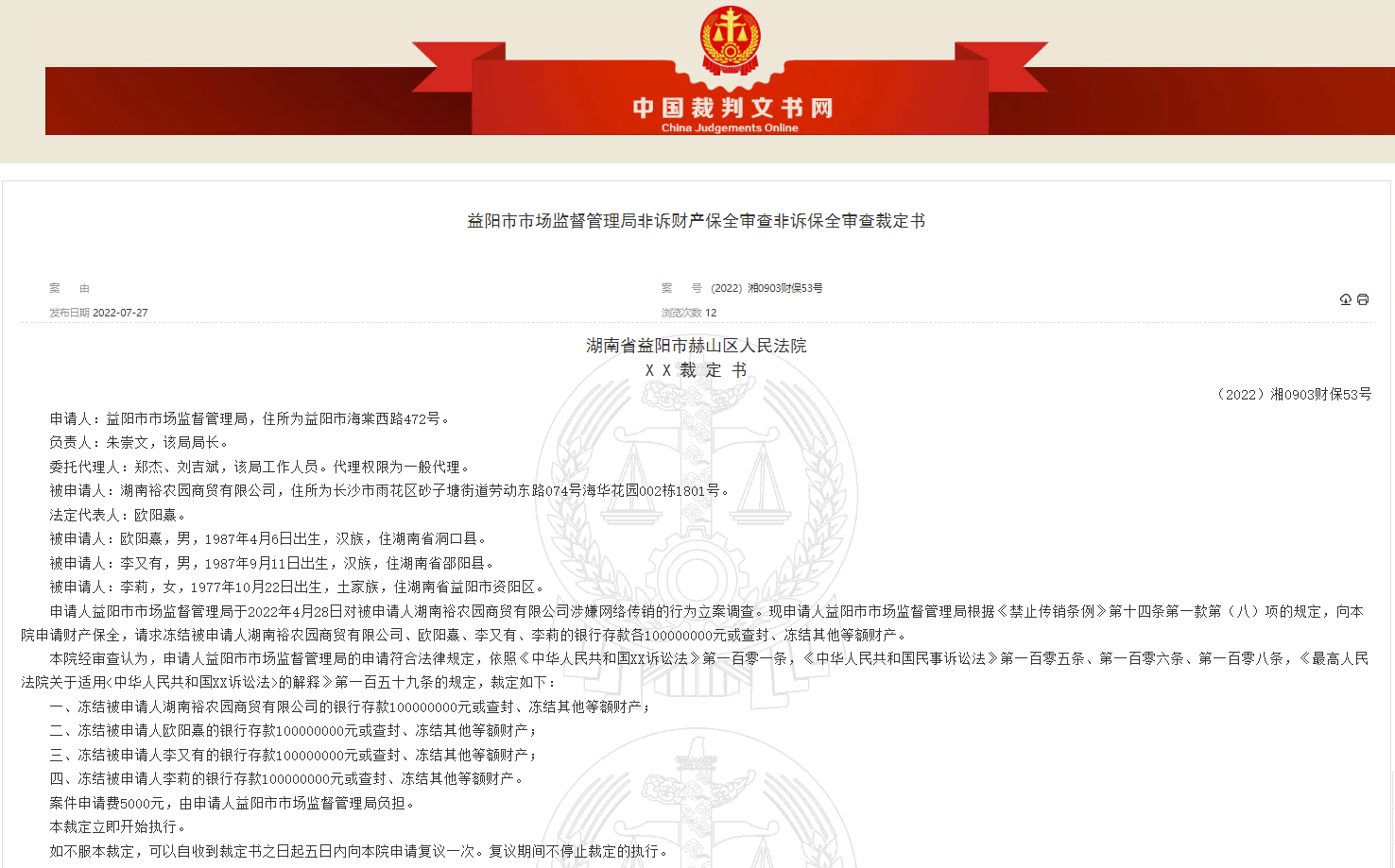 “裕农园”运营公司及关联人员因涉嫌传销被法院冻结4亿元