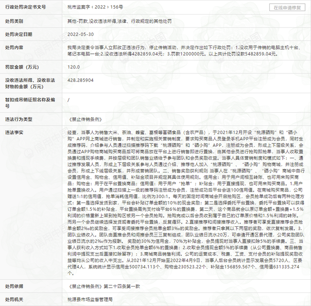 “桃源硒购”、“硒小购”APP运营方因涉嫌传销被罚没548万余元