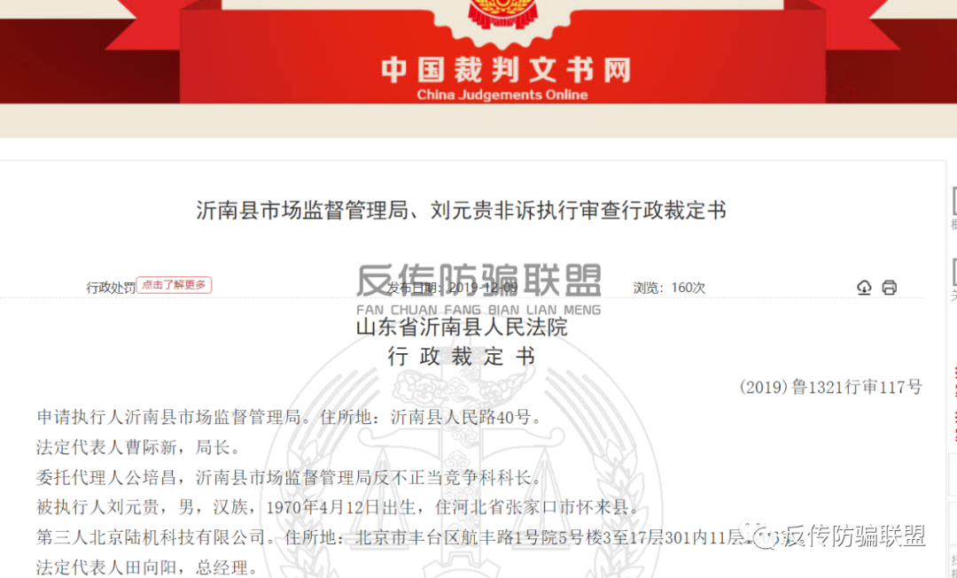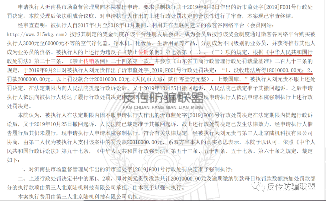 好景不长,2019年10月28日,陆机科技就又牵涉到另外一桩传销案中。据《沂南县市场监督管理局、刘元贵非诉执行审查行政裁定书》显示,被执行人刘元贵自2017年4月至2018年11月期间,利用其在互联网建立的微客谷网络平台(会员网站即上文提到的已无法访问的315wkg.com)按照其制定的奖金制度在该平台注册发展会员,成为会员后按照该奖金制度通过微客谷网络平台购买3000元至60000元不等的空气净化器、净水机、化妆品、生活用品等产品,分别成为不同级别的业务员,并获得推荐其他人成为业务员的资格。