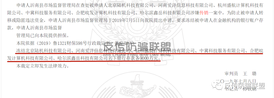 据《沂南县市场监督管理局、北京陆机科技有限公司执行实施类执行裁定书》和《沂南县市场监督管理局、北京陆机科技有限公司其他行政裁定书》显示,申请人沂南县市场监督管理局在查处被申请人北京陆机科技有限公司、河南爱洋信息科技有限公司、杭州盛航计算机科技有限公司、中冀科技服务有限公司、合肥皖发计算机科技有限公司、哈尔滨鑫岳科技有限公司涉嫌传销一案中,为防止被申请人转移或隐匿违法资金,于2019年7月5日向法院提出申请,要求冻结被申请人在金融机构的银行账户存款,法院随即冻结北京陆机科技有限公司、河南爱洋信息科技有限公司、杭州盛航计算机科技有限公司、中冀科技服务有限公司、合肥皖发计算机科技有限公司、哈尔滨鑫岳科技有限公司名下银行存款各9000万元。