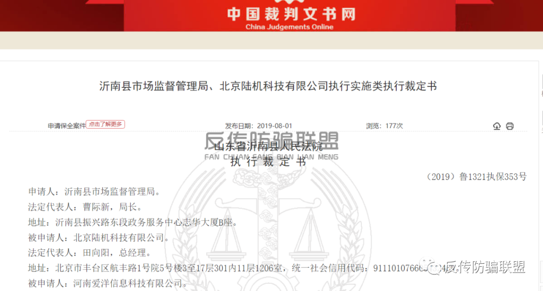 沂南县市监局认为,陆机科技的行为违反了《禁止传销条例》第七条之规定,根据《禁止传销条例》第十四条第一款第(八)项的规定,申请沂南县人民法院进行了财产保全,冻结了北京陆机科技有限公司等涉案企业的银行账户。